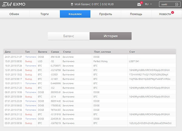 Рассмотрим одну из самых популярных бирж для обмена криптовалют на русскоязычном пространстве интернета exmo.com. Данная биржа имеет два языка интерфейса Русский и English. Торговать на Exmo можно 8 типами валют: USD, EUR, RUB, BTC, DOGE, LTC ,DASH, ETH .